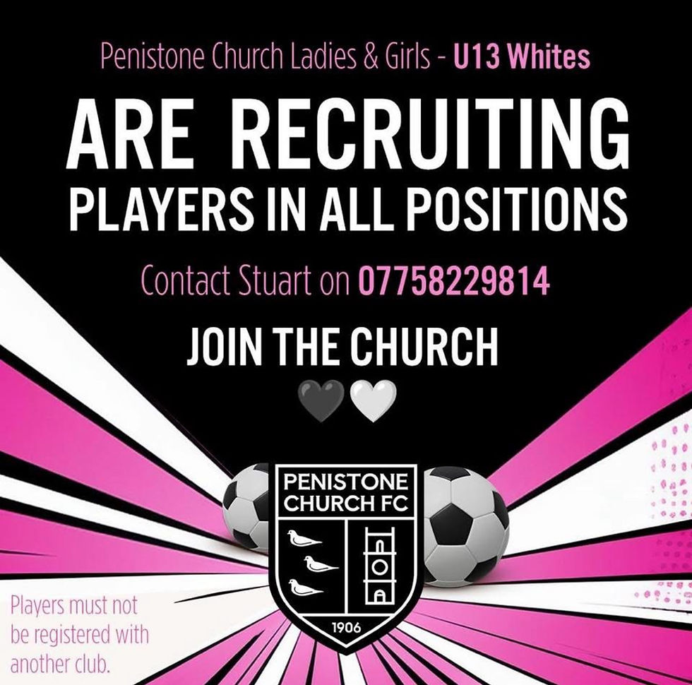 Penistone Church U13 Women Whites are looking to recruit new players to join a great group of girls. We train on a Monday at Penistone Grammar School. Contact Stuart on 07758229814. Players must not be registered with any other SHWGL team.