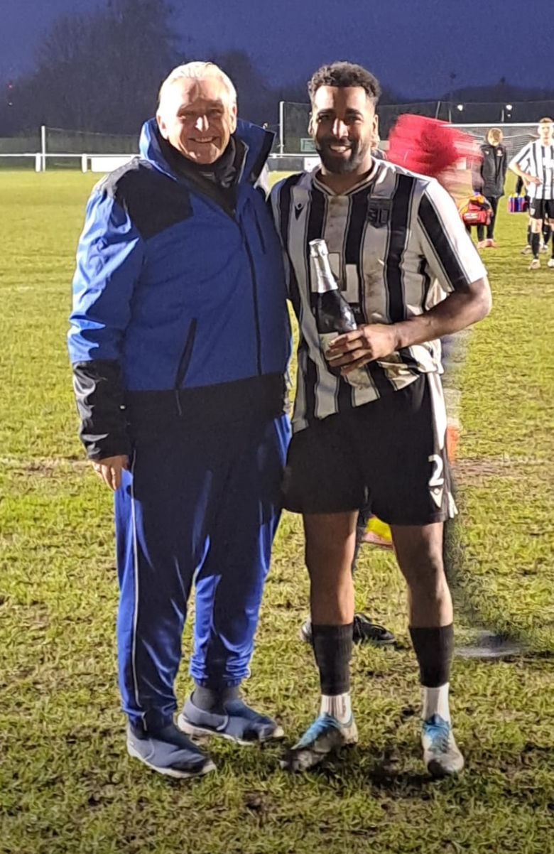 Man of the match picked by the match sponsors was Carlton Pownell , who had a good game at right back, looking to push forward at every attempt and supplying the assist for our goal. He was presented the award by Brian Lovell.
